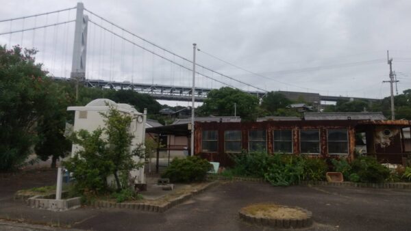 そんな定期船も橋の開通とともになくなり、船の待合所であった廃船のデッキ部分が現在バス停として残されています。